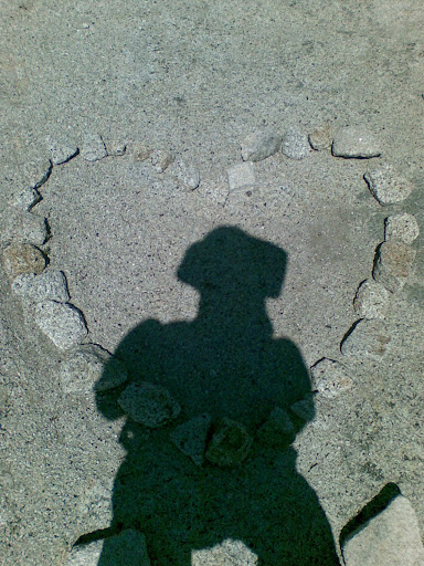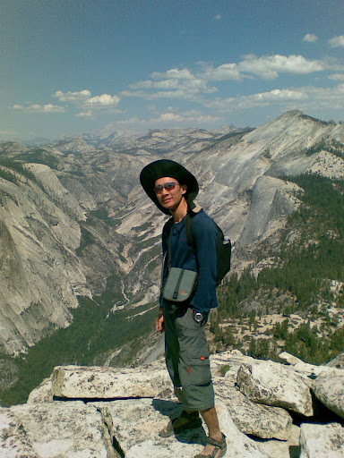 Half Dome頂端的景色展望還真是壯闊!整個Valley盡收眼底。這一個禮拜爬的路線歷歷在目,對面就是我們前天完成的Royal Arches,當時花了八個小時才爬的1400呎高度,現在在Half Dome下都顯得異常渺小(Half Dome標高8836呎,約2693米)。而El Captain則與Half Dome遙遙相對,下回來,一定得去那邊走走!整個Half Dome由於風化作用的關係,就像個超巨型的洋蔥一般,頂端是一片片的洋蔥片,相當特別!興奮的拍照,盡情享受在Yosemite的最後一天。還無聊的在頂上排了個愛心,想說拍照送給老婆!