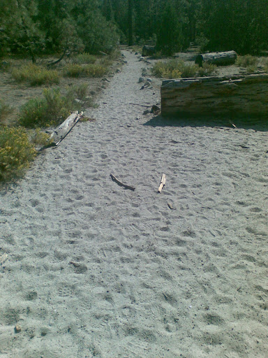 待了約莫半個小時,真的該走了!不過呢...一樣,又是塞車呀!這回學乖了,等了五分鐘,就決定從鐵梯外走下去。回程的路上,也終於可以慢下腳步細細品味一下這條健行步道了。或許是觀光客太多了,步道有些路段走起來像是在走沙灘一般,而八月的Yosemite相當炎熱,缺乏林蔭的路段,有種在沙漠中行走的感覺。不過呢...步道沿線的廁所倒是相當乾淨,且幾乎沒有難聞的味道,步道沿線據說Rnager會定期騎著馬上來巡視,所以沿線不少馬糞。另外呢...Yosemite的松果異常碩大,我特地以我的腳做為比例尺拍了張照片。