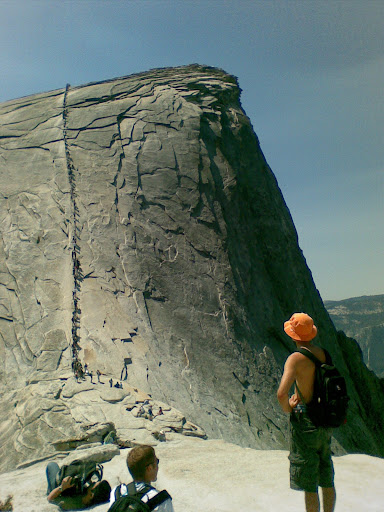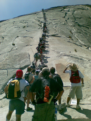不過,既然決定要多留一天,我自然也不會閒著啦!看了那麼多天的Half Dome,不去走上那麼一遭還真對不起自己,早上10:00,在Happy Isles下車後,也正式展開今日的Half Dome健行之旅。Half Dome是Yosemite Valley的招牌景點之ㄧ,每年數十萬人(或者更多?)來拜訪它,自然其登頂步道也是相當寬敞好走,一般而言,爬Half Dome可以選擇兩條路線:Mist Trail與John Muir Trail。兩條路線最後會在Neveda Fall匯合,最後順著Merced River的上游繞到Half Dome。我研究了一下手邊的地圖,Mist Trail會同時經過Vernal Fall與Neveda Fall,加上今日天氣炎熱,Mist Trail聽起來就是條涼爽的步道,也自然成為我的選擇。沿途的遊客真是絡繹不絕,許多友善的老外看到我都會跟我打招呼,一對熱情的情侶更是強力建議我一定要爬上Half Dome。由於一個人走,我幾乎是以急行軍的速度在前進。約莫近三個小時就來到了Half Dome的底部,乖乖!排隊上Half Dome的人還真多。或許是爬上去的路有些暴露感,大部份遊客都很慢的移動,我幾乎在原地等了二十多分鐘,才開始緩慢前進。最後,我索性就爬鐵梯外側上去(叔叔有在攀岩的,小朋友不可以學哦!),一條康莊大道呀!