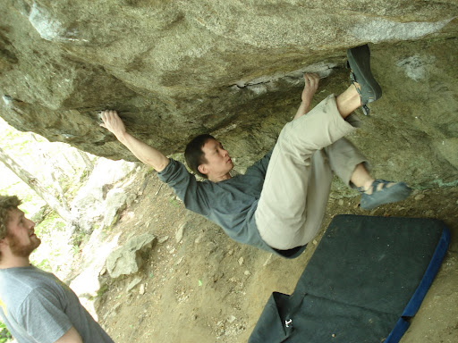 我們先近到所謂的warmup area小試身手,這邊的路線大部分簡單又有趣,我一開始先攀爬一條V3的Cave Roof當做熱身,大角度卻也都是大點,輕鬆Flash。再來繼續嘗試V4的Cave Overhang,起攀的側拉交叉手動作我很喜歡,立體的地形真的是人工岩場所無法模擬的。這條也是輕鬆Flash,開始有點懷疑這邊的級數認定。再嘗試一條V4的經典路線Neil's Lunge:一開始就是相當漂亮的lay-back left-facing tufa,接著一個還不賴的crimp,crux是要做一個大動作的伸展去抓一個pocket,之後就mental完攀,沒有想像中難,還是被我falsh。老外岩友開始鼓吹我嘗試再難一點的路線。我挑了一條V5的Ab Master爬,前面的動作都是大伸展,點不會太差,可是方向都不是很好,crux是從一個鋒利的crimp接到一米外的pocket,我用動態的方式:fall!後來嚐試了lock-off的靜態動作,發現可行,可是需要很精準的抓到pocket,嚐試了好幾次,右手手指頭實在痛到不行,就決定放棄了。